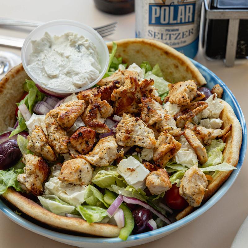 Marinated chicken, lettuce, tomatoes, onions, feta & homemade yogurt sauce.